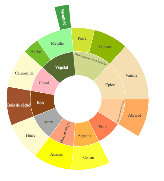 Nez - Les arômes se montrent plutôt discrets, évoluant autour de la vanille douce, complétée par des notes de menthe fraîche, de cèdre et de fruits à chair blanche comme la pomme et l'abricot.